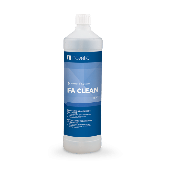 Om uw aluminium overkappingen, glazen schuifwanden en profielen in topconditie te houden, is een krachtige maar veilige reiniger essentieel. FA CLEAN van Novatio is speciaal ontwikkeld voor een diepgaande reiniging van aluminium oppervlakken, zonder ze aan te tasten. Deze reiniger verwijdert moeiteloos vuil, vet en andere verontreinigingen die zich in de loop der tijd ophopen, zelfs in de moeilijk bereikbare hoeken.